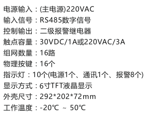 具有兩路RS485信號,一路連接工控PC機,一路連接485變送器和報警繼電器。